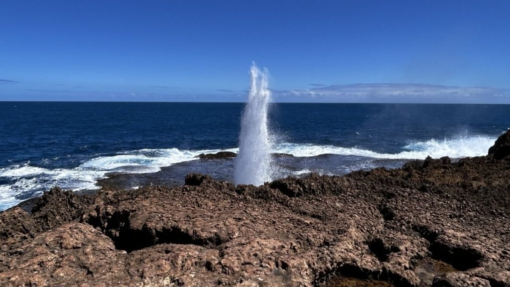 We took a trip out to the Quobba Blow Holes. A, because we hadn’t been there before, and B, because it was there. Scrambled over some rough rocks to get to the blowholes, but it was worth the effort. The sea was rough, it was windy, of course, so they put on a great show for us. Didn’t disappoint.