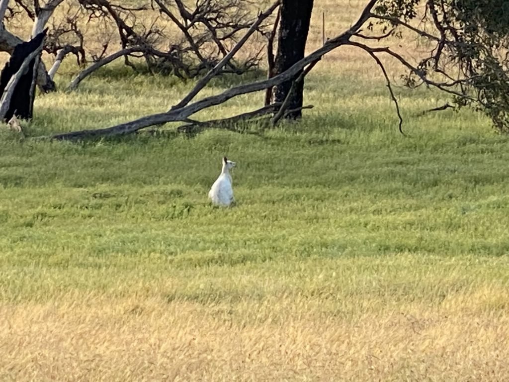 Mission accomplished!!! Spotted the albino down the bottom of the camp, and in I went in to get a photo. Other kangaroos were a bit wary, but not ‘snowy’. Unperturbed, he just kept grazing and took a little while till he turned a bit and stood up. Looks a bit muscular, but beautiful for a young buck.