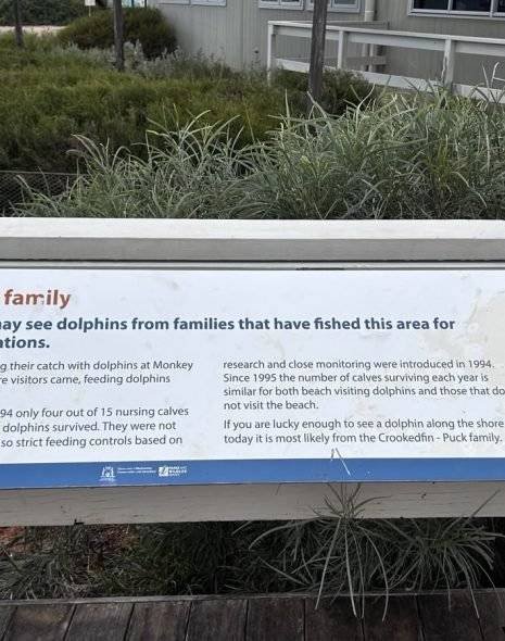 The jewel in the crown of this area, is Money Mia. Twice a day the rangers feed dolphins by hand. Visitors can take photos from the shore or from a short jetty, and occasionally they will select a few visitors to join them. Obviously we were there late in the afternoon, looked through the Visitor’s…