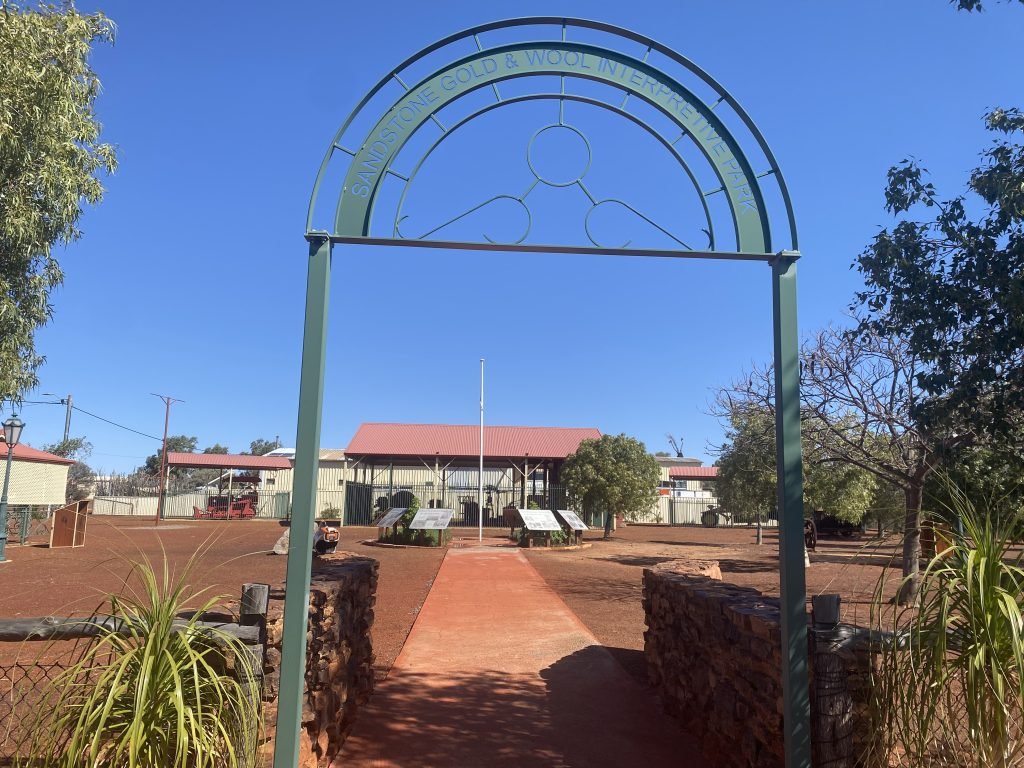 We couldn’t go past the neat park featuring old farm machinery and some in security containers with graders, tractors and a wool bailing machine. The archway into the park with picnic tables named it Sandstone Gold and Wool Enterprise Park with information boards on display.